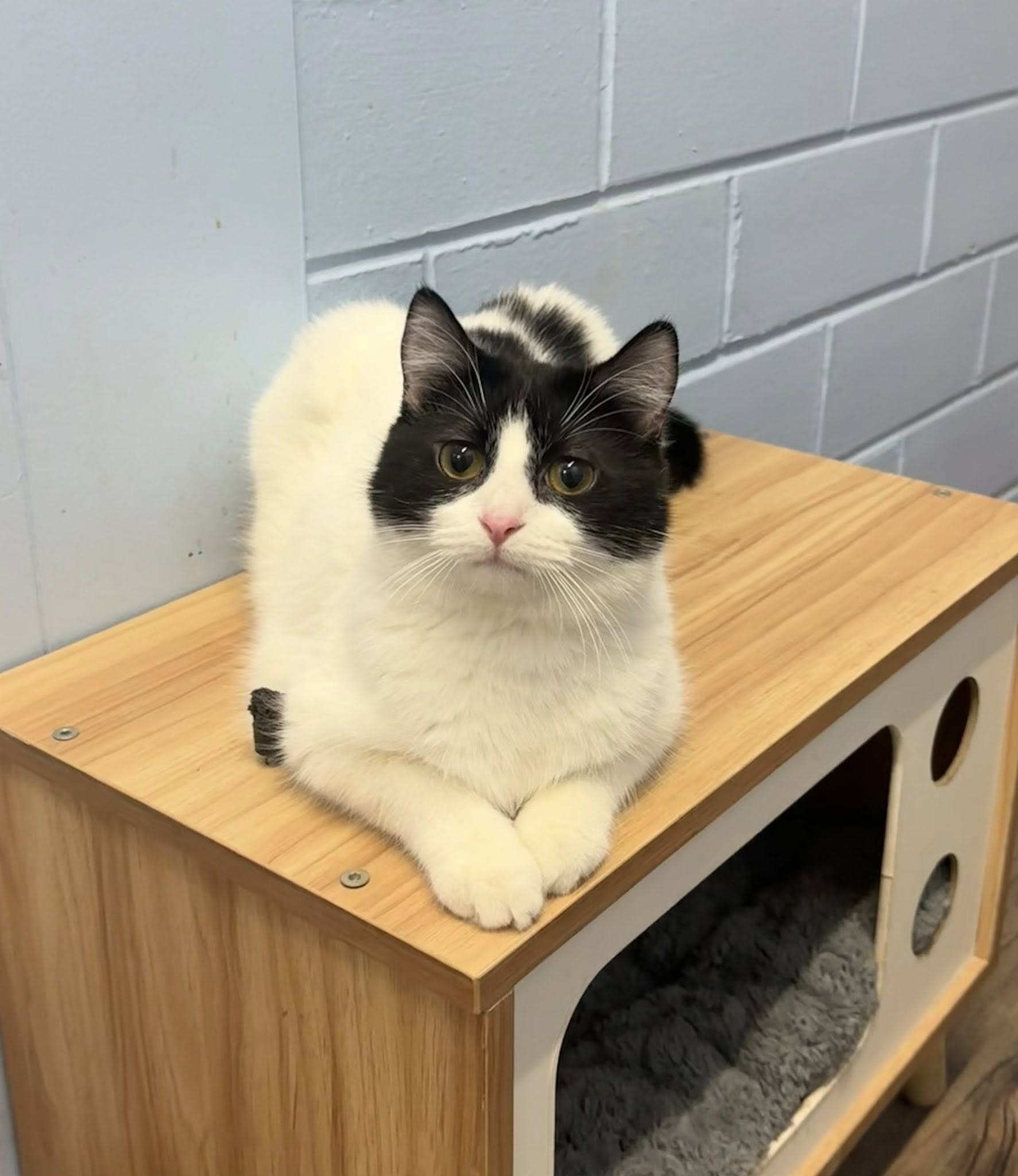 Maybell, or "May May", is a 4-5 year old female looking for her forever home. She was surrendered when she lost her home due to a fire. She gets along with other cats and lived with a small dog. She loves affection and to explore the shelter.